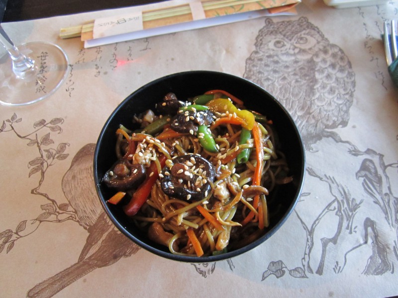 Из приятных вещей отмечу латте, который пил в Васаби впервые. Жаль, что не догадался заказать какой-нибудь сироп, например, карамельный или вишневый. Было бы очень к месту. Далее при активном участии Кати формировался заказ. Всё на фото – салатик Унаджи Ясай Сарада, супчик Шаке Удон, на горячее – жареная лапша «зеленый чай» с курицей. Всё очень понравилось, за исключением маленького пустячка, супчик оказался островат, обнаружил в нем колечки порезанного перца чили, а в меню об этом, к сожалению, ничего не сказано.