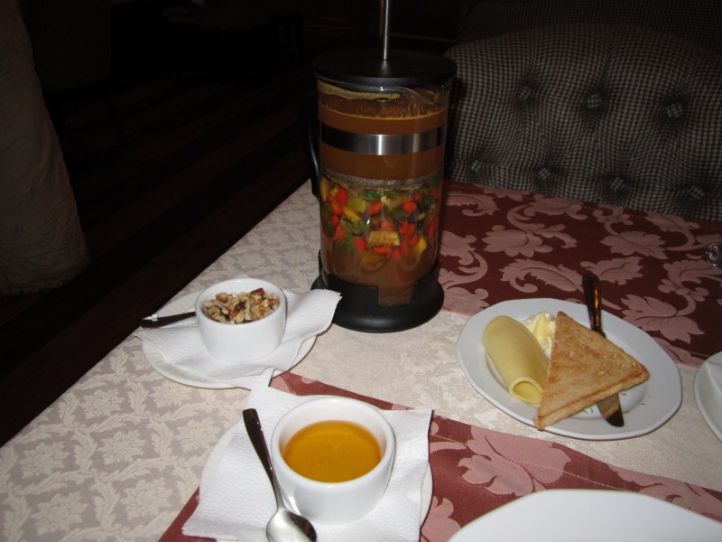 Между тем, аппетит рос в геометрической прогрессии. Думаю, Ксения была нимало удивлена, сколько всего заказал на завтрак, а главное со всей этой едой успешно справился, наш гость. Во-первых, творожный микс с черникой - вне всяких сомнений именно этот из четырех вариантов - творог и черника - это то, что я люблю. Хотелось повторить, но думаю не влезло бы. Во-вторых, очаровательно нежная овсяная каша на молоке с медом и орехами. Всё в отдельных креманках и в очень нескромных количествах. Вкусно, ажно дух захватывает от такого воспоминания.