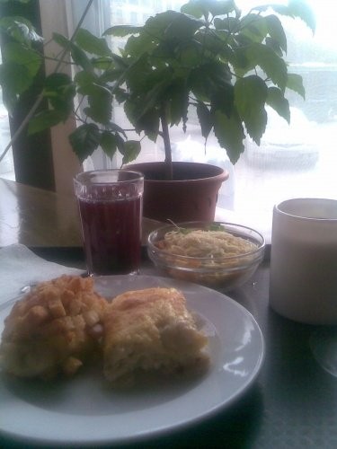 Далее супы слева, справа раньше были соки, а теперь нет, что несколько огорчает. Масса горячего и гарниров, всяки пельмени, кисели, чай на травах (очень нравится), разные приправы. На кассе, которых две, можно легко и быстро без проблем расплатиться безналом. :kachayusuper: Зал большой, можно сесть посередке, а можно и к окну с видом на Ленина-Луначарского. Кстати, фотка дана, как раз, с видом на улицу, - на фотке куриная котлета в сухарях и картофель, запеченный с сыром, салат с копченой грудкой, кисель и чай на травах . Общее впечатление - жирновато получилось, вместо запеканки в следующий раз взял рис с овощами - вкуснее и полезнее. Да, забыл сказать, что за неделю был здесь дважды. Сегодня в баре взял бокальчик красного сухого из Аргентины - Тосо Темпранильо, Кстати, недорого получилось. Очень рекомендую!