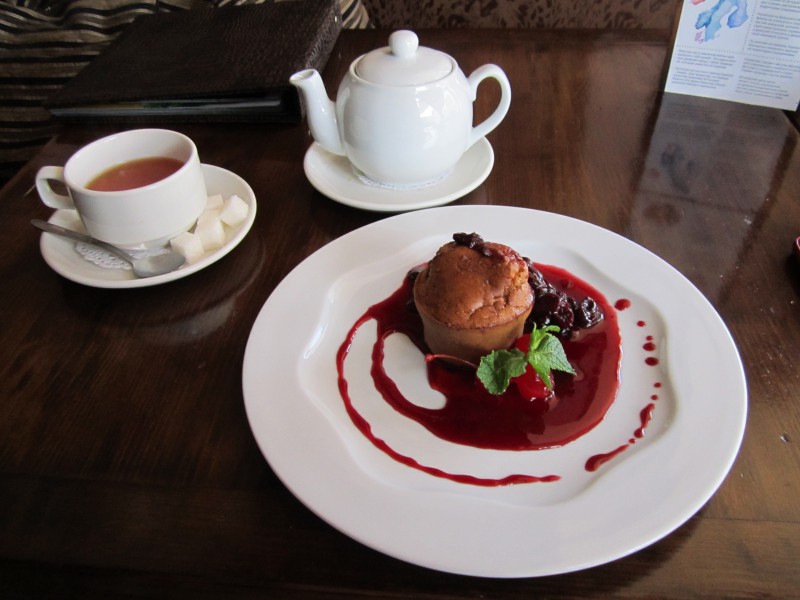 Конечно, не отказался от десерта из того же набора - "Скара кекс", или, как написано в меню, "полезный кекс из гречневой и пшеничной муки, с жареным миндалем, грецким орехом и кофе. Подается с вишневым соусом". Короче, шёл в Тотем, а побывал, словно бы в Норвегии. Остался очень доволен.
