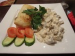 Далее по совету Полины заказал бефстроганов из говядины с пирогом. Заказ был сделан из интересного меню "Недели русской кухни". Само мясо было прекрасно, хотя соус вызвал у меня некоторые вопросы - кисловатый какой-то. Наверно, тут возможны и иные решения. Пирог картофельный с шампиньонами, сам пирог очень к месту, но клиенту нельзя и он сам не любит шампиньоны - попросту их отделил от пирога, благо такая возможность была. Про подгарнировку из овощей скажу следующее - мало и все они комнатной температуры.
