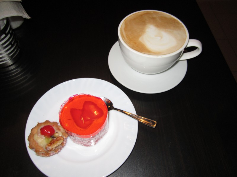 На стене - доски с наименованием всех классических видов кофе и ценами. Широкая линейка сиропов, которые на любителя добавляют в кофе. Со второго раза наконец удалось рассмотреть богатство кондитерки, которую сюда поставляют. Всё очень оригинальное, красиво яркое и очень-очень свежее и вкусное. Долго в последний раз никак не мог сделать окончательный выбор и лишь благодаря помощи бариста мне удалось определиться, а чего я собственно хочу. В общем, можно утверждать, что хочу всего и сразу.